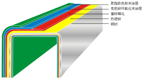 熱浸鋅:起到電化學(xué)保護(hù)作用,由內(nèi)到外防止鋼鐵基材的生銹。